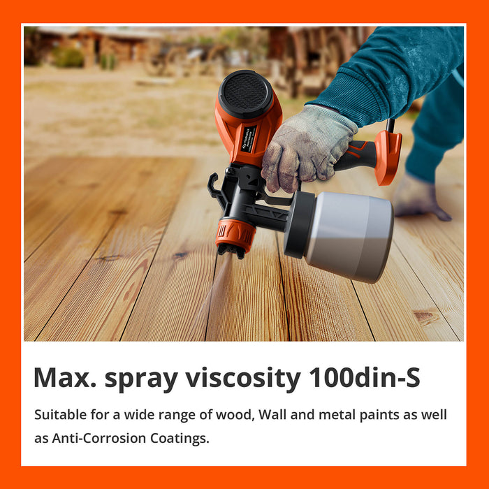 This electric paint sprayer gun features 3 adjustable spraying modes and a precision flow control dial for pinpoint accuracy and even coverage, paired with 4 interchangeable nozzles (1.0mm, 1.5mm, 1.5mm, 2.0mm). Engineered to handle paints up to max 100 DIN-s viscosity, electric spray paint gun for painting effortlessly tackles oil-based, water-based, or specialty coatings without dilution, such as Dense coatings like sealants, stains, enamels.