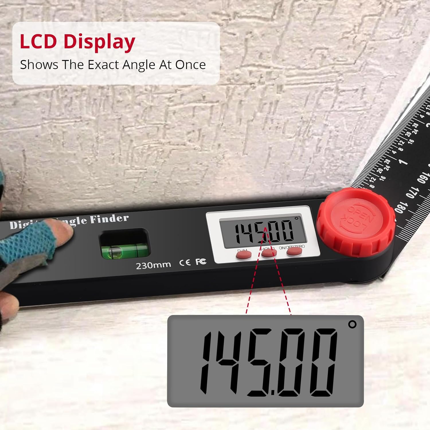 • 【Large LCD display】This protractor angle finder designed with full screen large LCD display, easy operation with only three press-buttons, easy to measure and easy to read. This angle gauge will automatically power off after 5 minutes without operation.