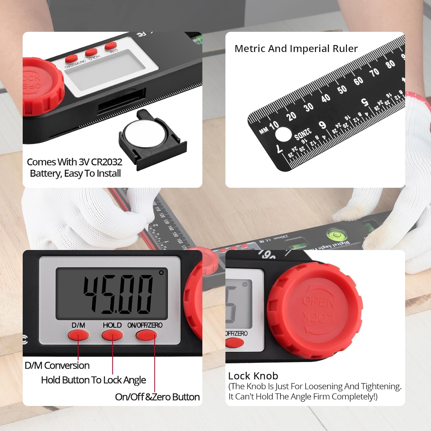 • 【Measure Degrees & Data Hold】Hinge mechanism on the angle rule allows a full range of 0 to 999.9-degrees to measure inside outside. Display has a hold function to freeze movement for accuracy. If you want to use data holding function, you need to press the HOLD button in red. (The knob is just for loosening and tightening. It can't hold the angle firm completely!)