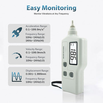 • Wide Measuring Frequency Range: The vibration meter have an acceleration high frequency measuring range of 1KHz to 15KHz / low frequency range of 10Hz to 1KHz, velocity and displacement measuring range of 10Hz to 1KHz (Low frequency), covering the frequency range of most mechanical systems.