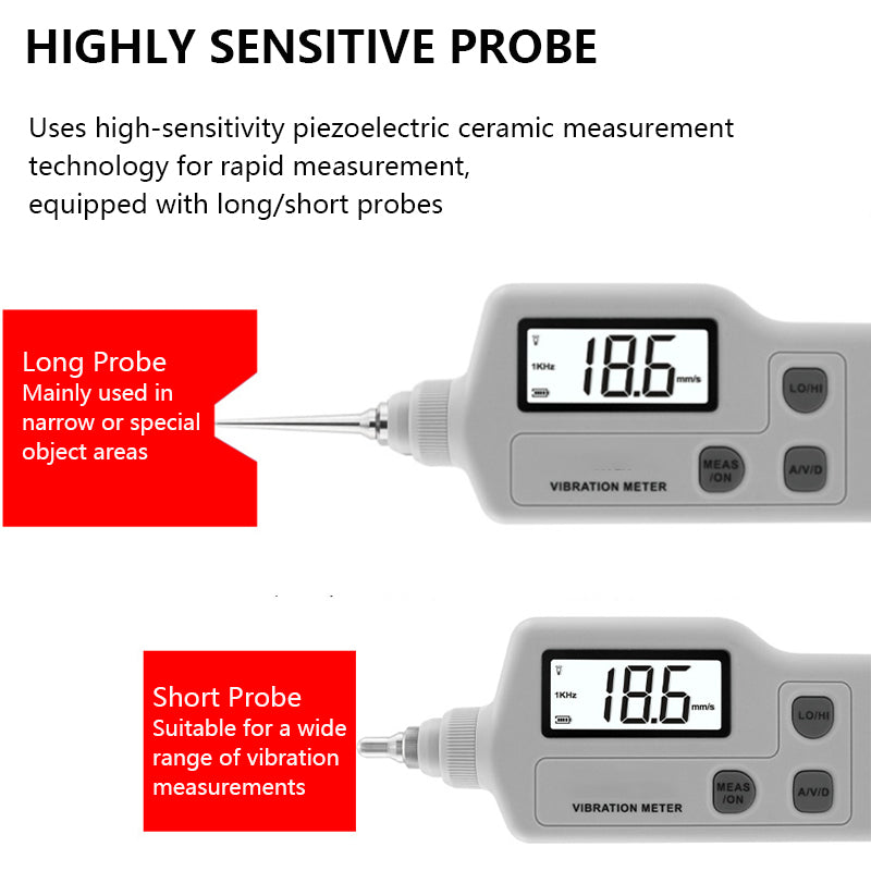 • High Sensitivity: The vibration meters adopts a piezoceramic accelerometer (shearing Type). acceleration: 0.1 to 199.9m/s2 at peak, velocity: 0.1 to 199.9mm/s RMS, and displacement: 0.001~1.999mm. accuracy up to ±5%±2digits, which can accurately measure very small vibrations.