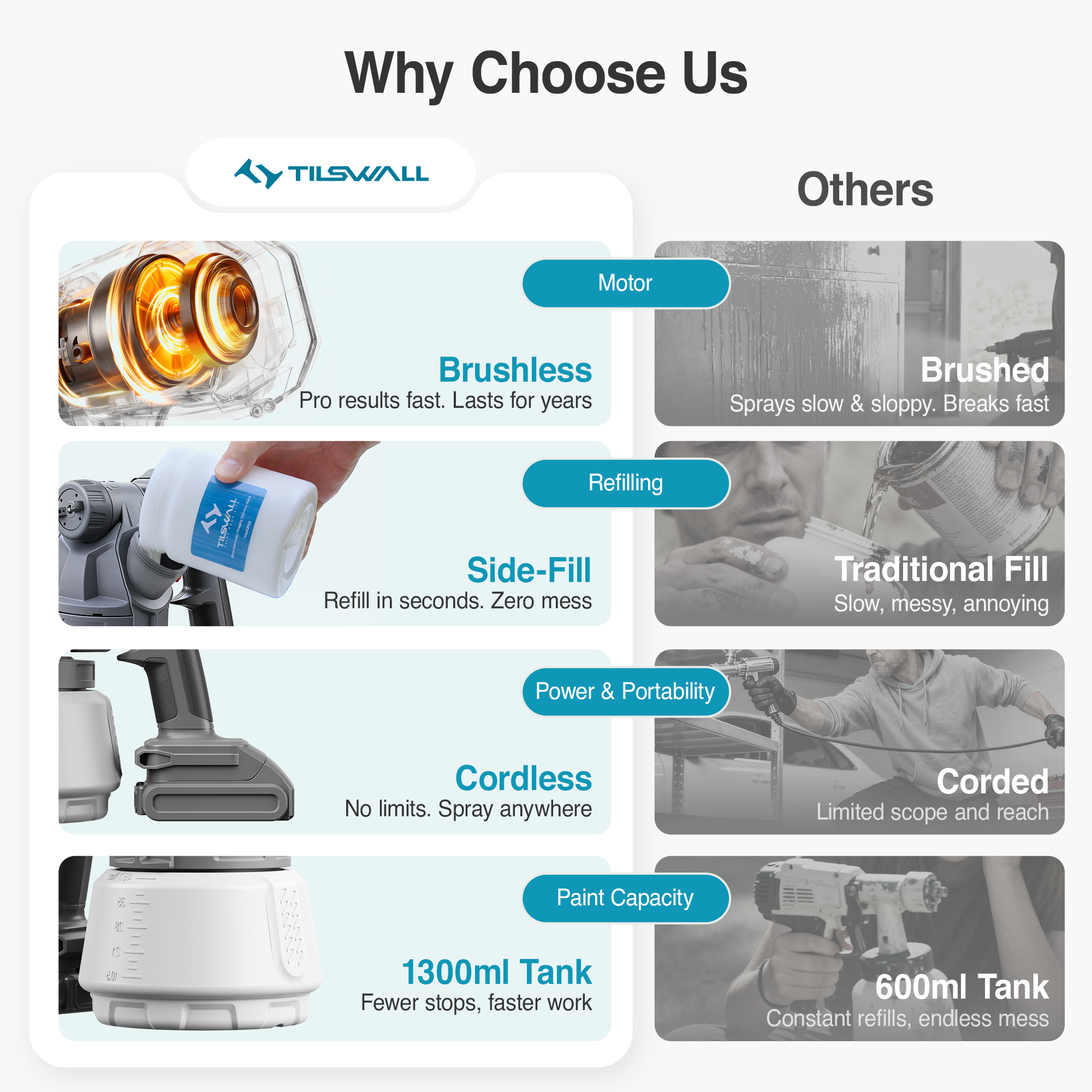 Tilswall Brushless Cordless Paint Sprayer Compatible with Dewalt 20V Battery (Battery Not Included)