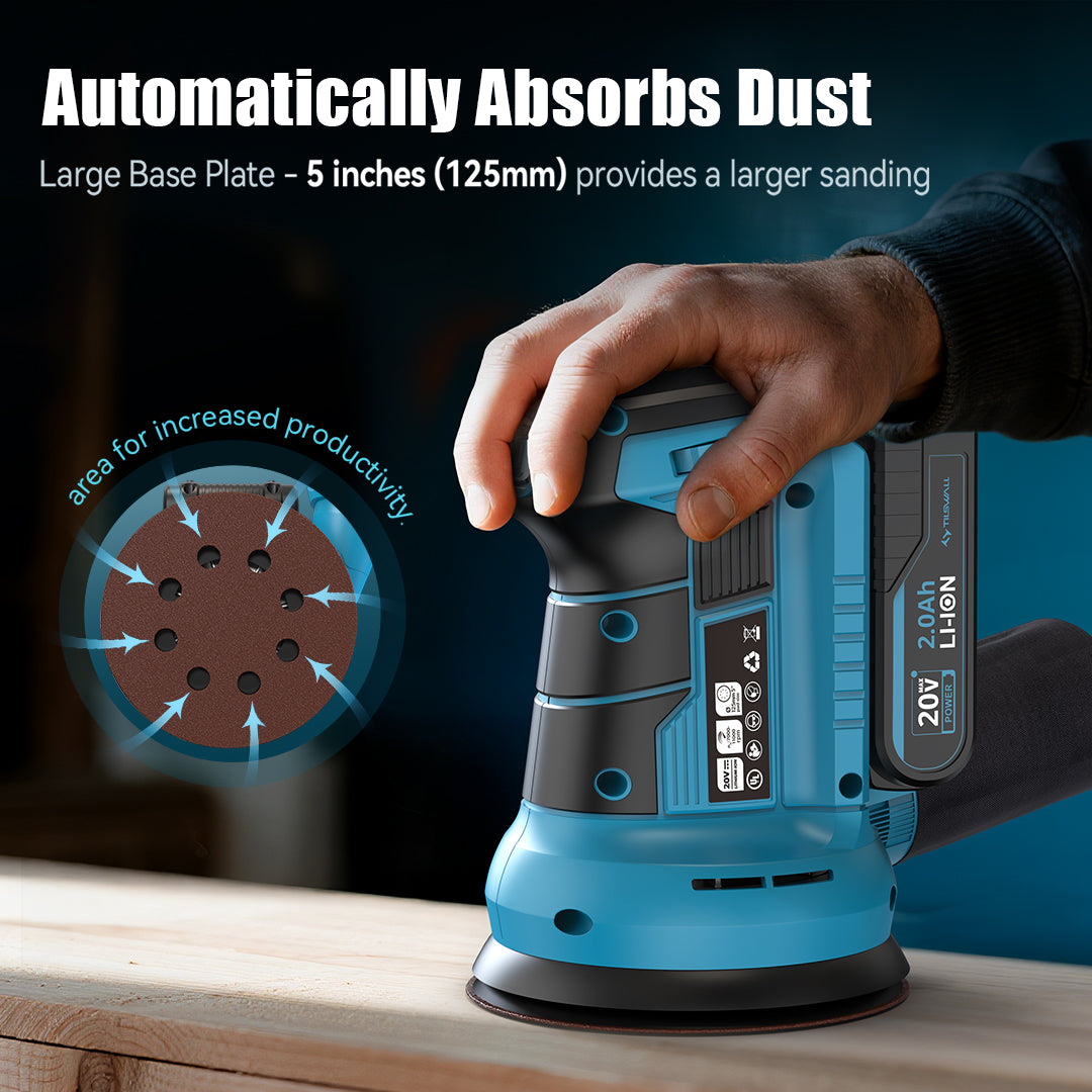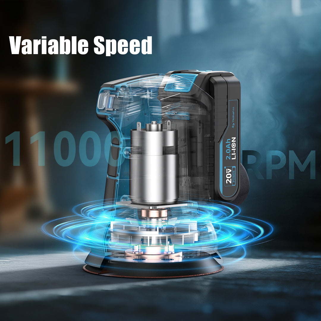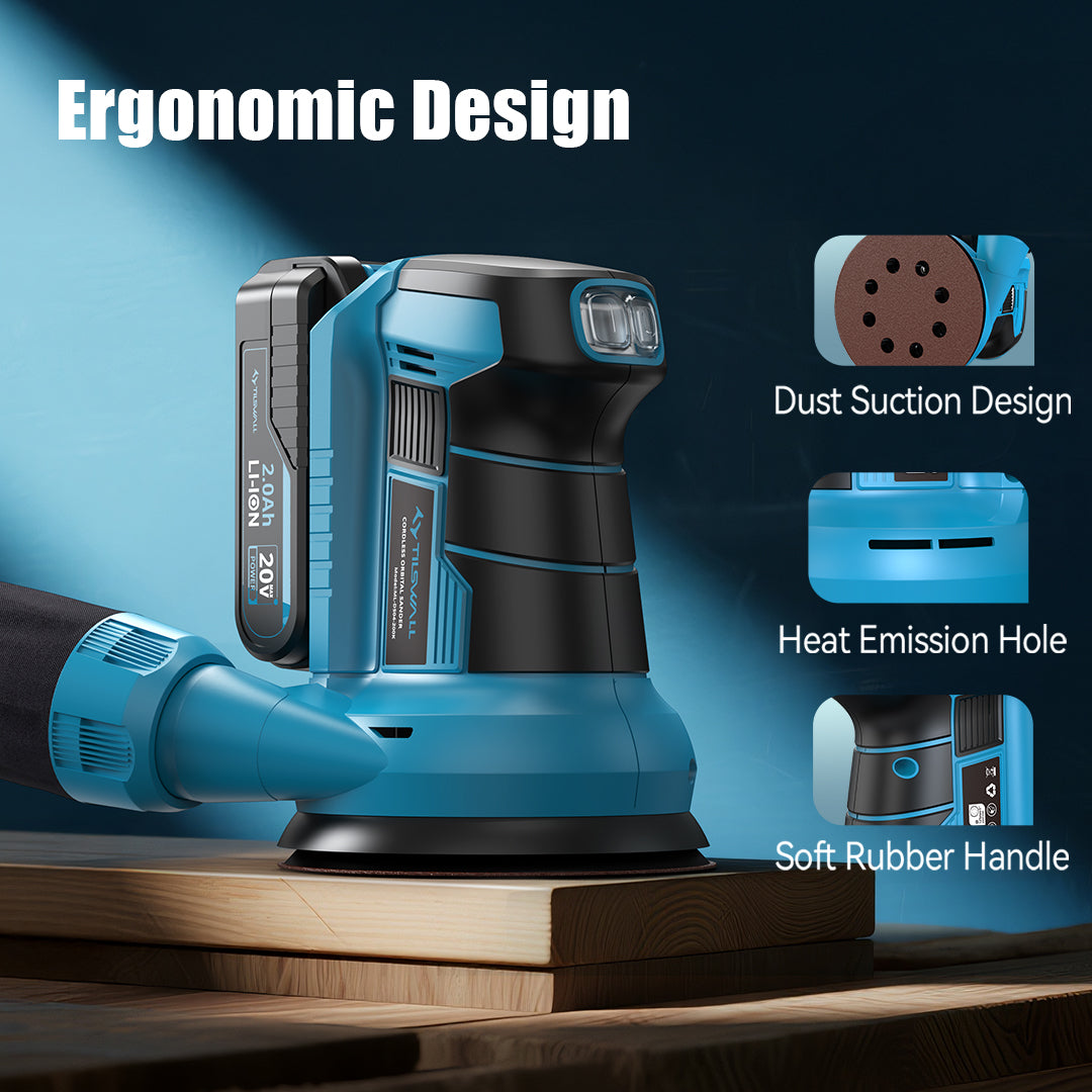 Tilswall 20V cordless orbital sander is equipped with a high-performance motor delivering 7,000–11,000 OPM variable speed. This palm sander tool offers precise control for different materials, from quick material removal to smooth finishing, this sander delivers professional-grade results