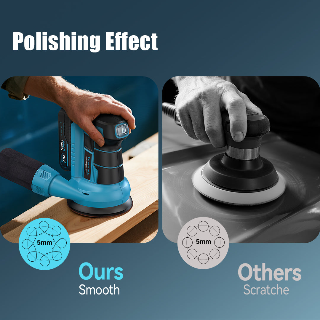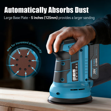 Our 5 inch random orbital sander (also known as a dual action sander) provides wider sanding coverage, helping reduce sanding marks and improving surface quality. Ideal wood sander for woodworking, furniture refinishing, metal polishing, and paint removal