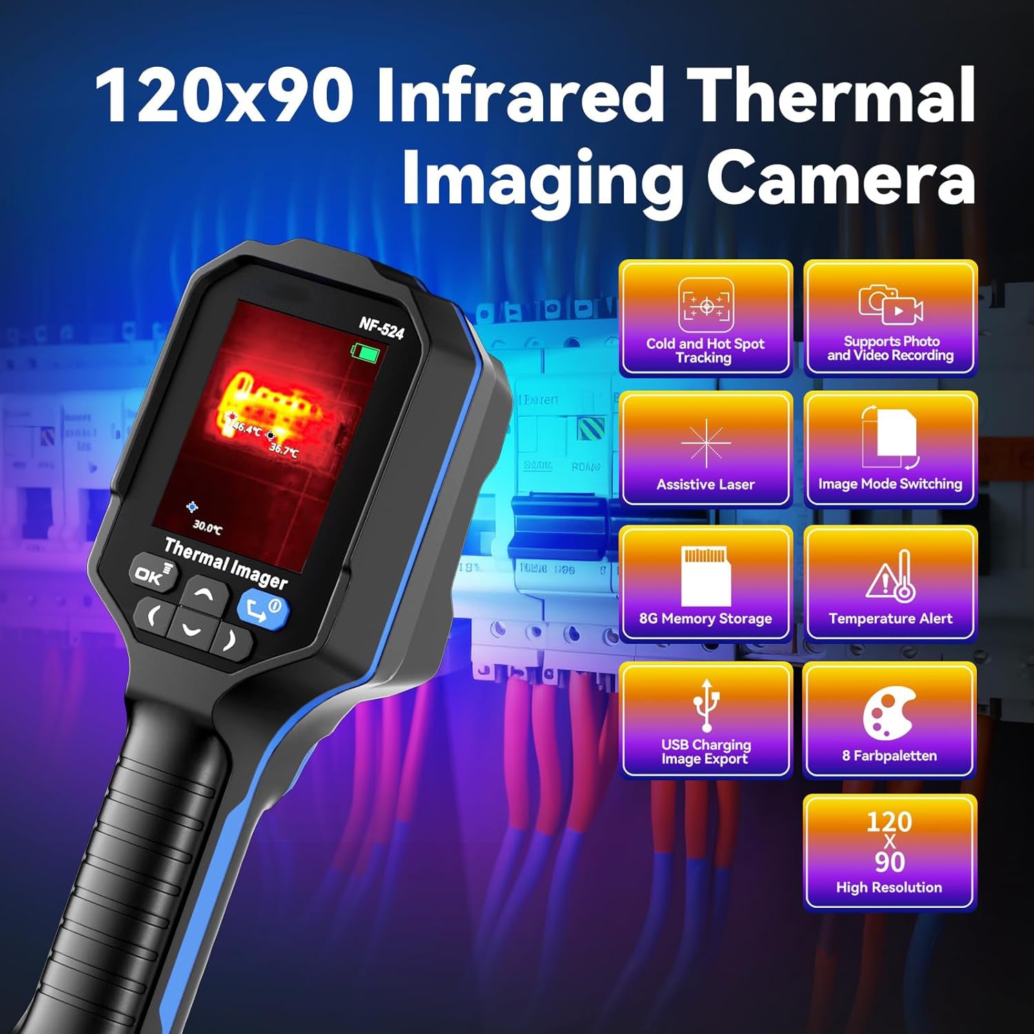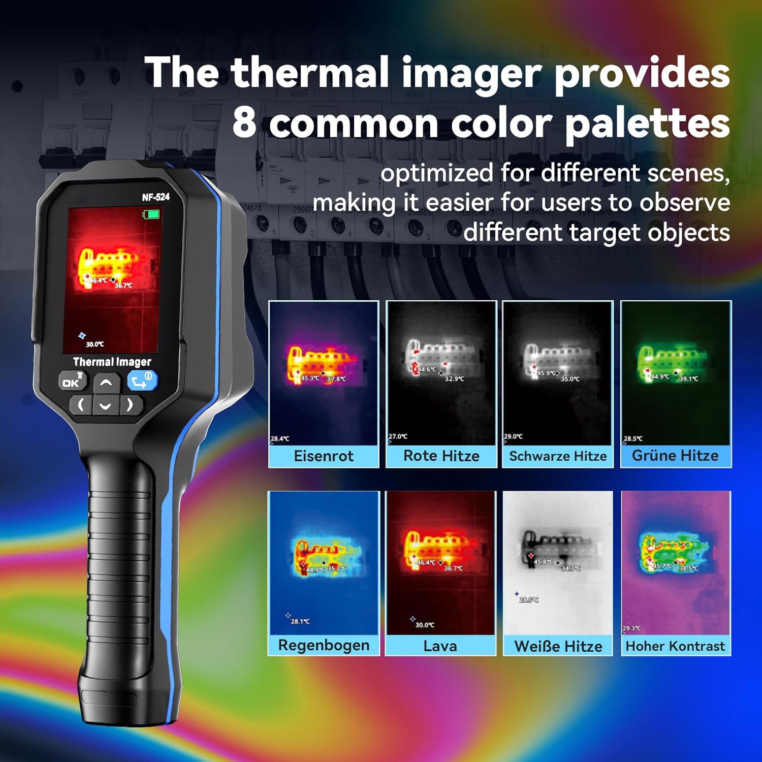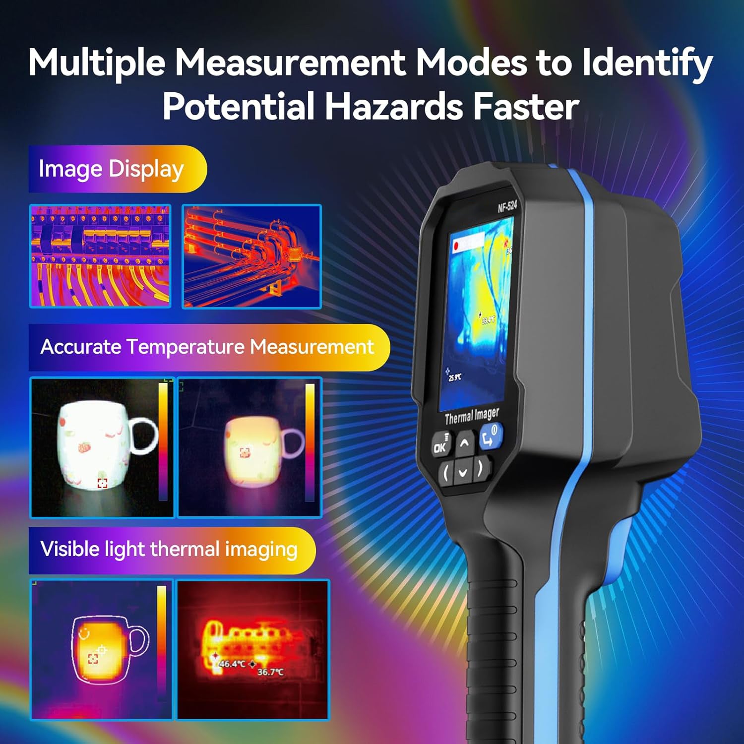 The infrared camera has 5 measurement image modes: Edge Fusion Technology, Thermal Imaging, Dual Light Fusion, Visible Light and Picture-in-Picture, 8 color palettes: Iron Red, White Hot, Black Hot, Rainbow, Red Hot, High Contrast, Green Hot, Lava to choose the ideal color scale for your work. It can be used in a variety of applications such as automotive, industrial inspection, security, firefighting and detection