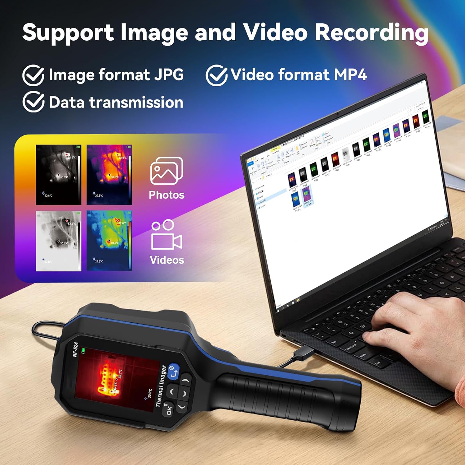 The infrared thermal imager has a built-in laser pointer to help you locate the inspected object in a dim environment or a small area. The powerful one-key photo viewing and video recording function allows you to share the photos you took to your computer. (Laser: Class 2, <1mW)