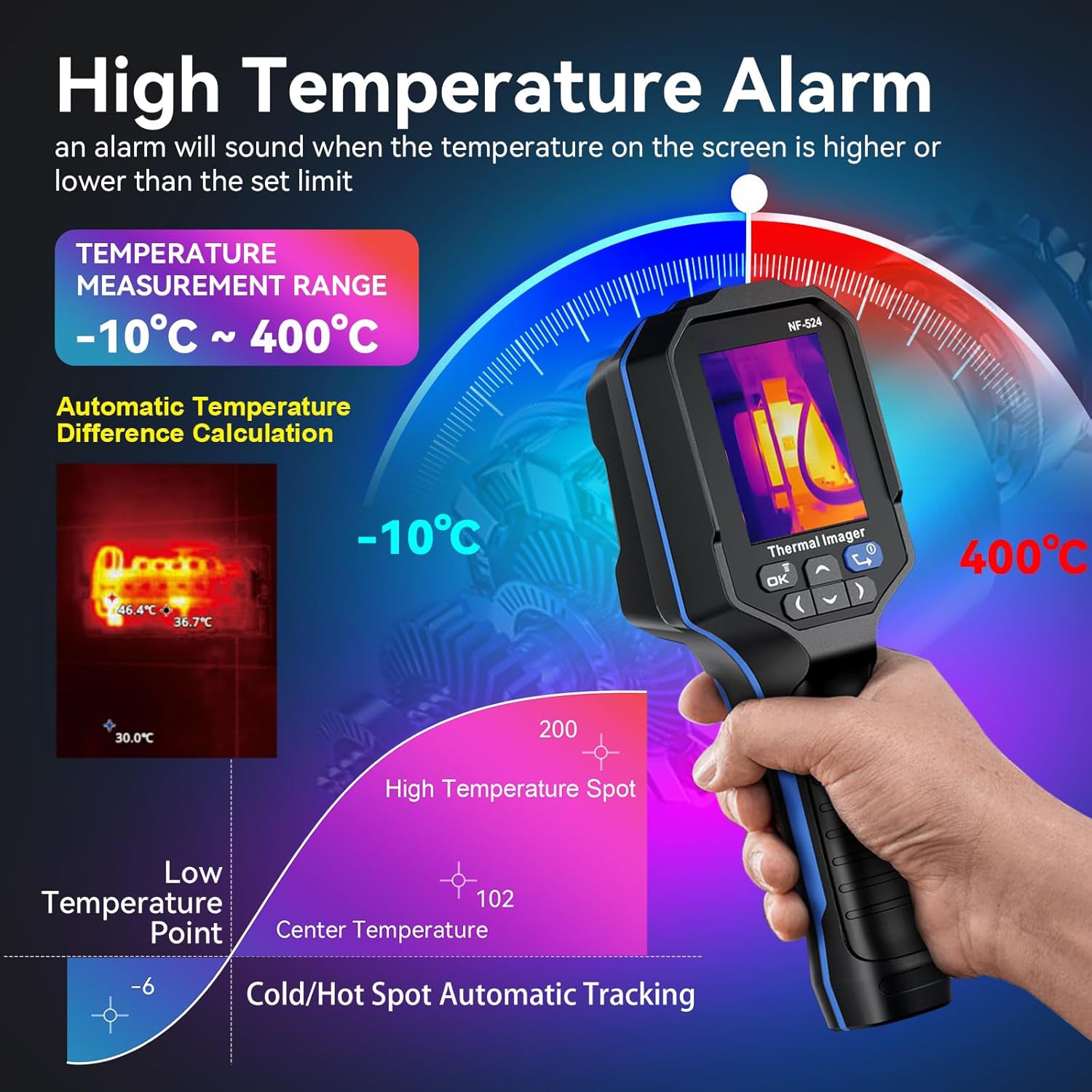 The thermal imager has an enhanced test range of -4°F to 725°F (-20°C to 400°C), which can accurately perform within ±1.8°F or ±1% of the temperature reading range. It also has automatic tracking and alarm functions, which can automatically track cold spots and hot spots, and automatically lock the lowest and highest temperature points, effectively assisting various temperature detection tasks