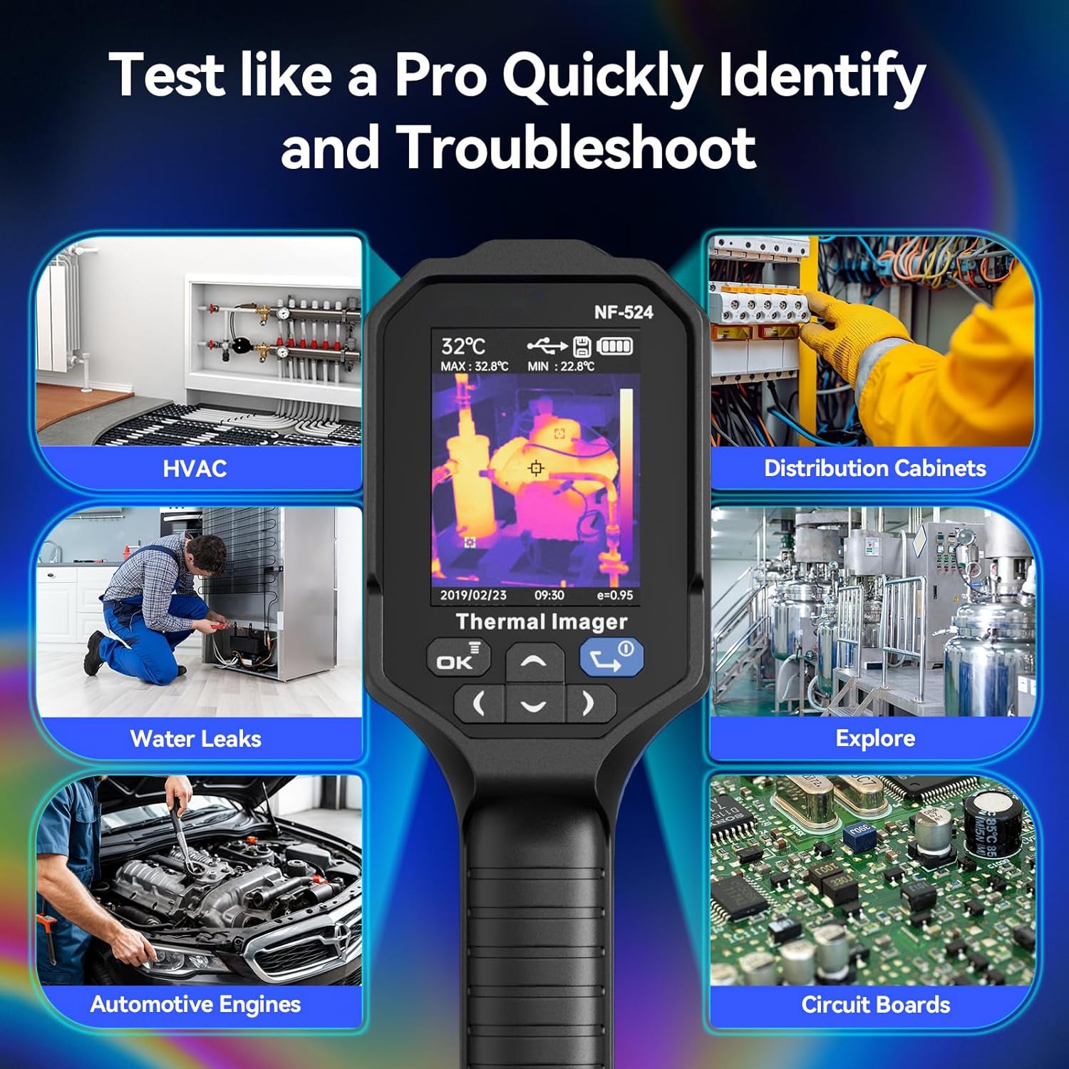 The handheld thermal imager allows users to adjust the distance to the object and fine-tune the emissivity setting according to specific materials, ensuring more accurate temperature measurements. It is ideal for home inspections, missing insulation, air leaks, water damage, firefighting, agriculture, building maintenance, HVAC troubleshooting, and professional electrical and mechanical system inspections