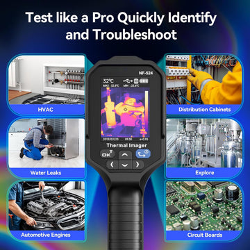 NF-524 infrared thermal imager features IP54 protection and a 2-meter drop-proof design. It also has a built-in 5000Ah rechargeable lithium battery that supports up to 12 hours of continuous operation. The long battery life allows you to easily handle high-intensity measurement work. Includes: NF-524 thermal imager, built-in 8GB memory card, USB-C data cable, lithium battery manual, and product manual